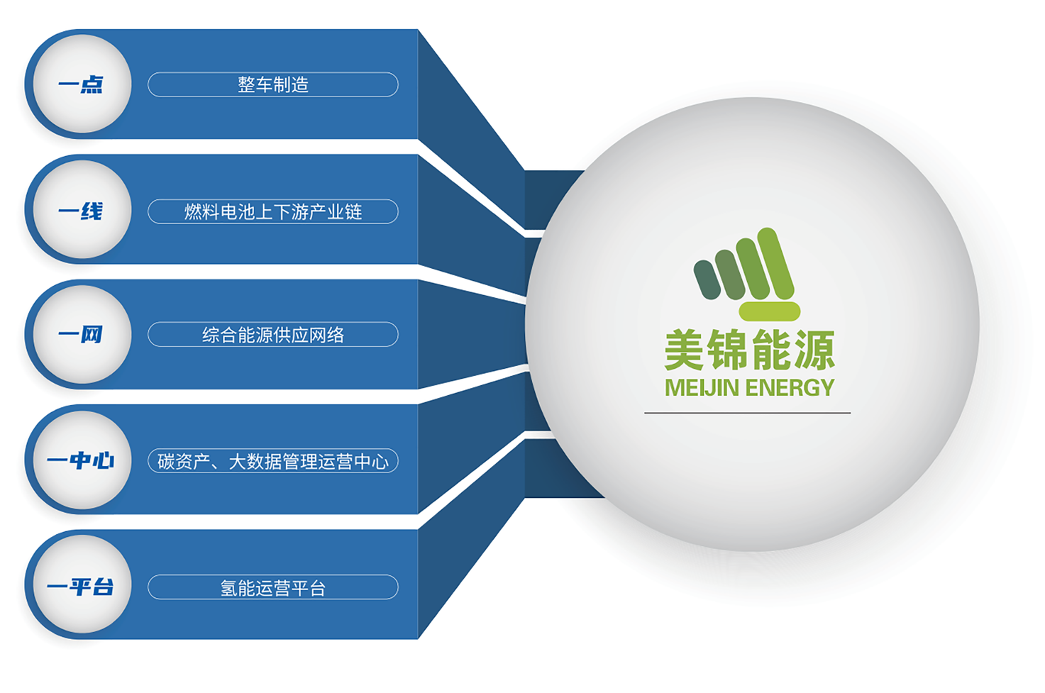 美錦能源氫能產業(yè)發(fā)展全面推行“五個一”戰(zhàn)略:“一點(整車制造)、一線(燃料電池上下游產業(yè)鏈)、一網(綜合能源供應網絡)、一平臺(碳資產、大數據管理運營平臺)、一中心(氫能汽車運營中心)”。